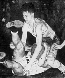 ![]() Morris (top) fights for control of the ball with USC Trojans player Dick Bailey (bottom) on March 15, 1943. | |