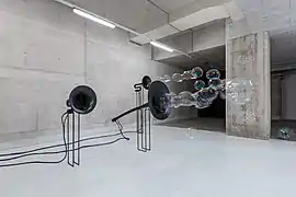 The installation consists of three sculptures of different sizes made of polyurethane, which, similar to ship horns, emerge in exponential funnels. The objects are capable of generating sounds with the use of compressed air. With each tone, large soap bubbles appear on the objects' flare. They increase in size with the sound duration, eventually detach from the horn and float through the room until they burst at an unpredictable moment and location in the space. The sometimes man-sized soap bubbles can travel over twenty meters, depending on the thermal condition. Visitors freely move on runways through the room and encounter the floating objects.[1]