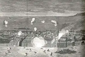 ![]() Iquique, Peru, on July 16, 1879. Bombardment by the Chilean navy. | |||||||