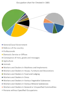 Elmsted was featured in the 1881 census which provides information on the occupational structure of the population at the time.[23] The majority of men and women worked in agriculture which reflects the rural nature of the small parish. The second largest group at that time were those working in domestic service or in offices. It is made up largely by women who were working at home whilst others living in the house would go out and work. Notably only 1 women was recorded as working in agriculture which shows how the industry was male dominated at the time.
