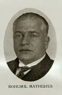 Bohumil Mathesius (July 14, 1888 in Prague – June 2, 1952) was a Czech poet, translator, publicist and literary scientist – expert on Russian literature. He was a professor at the Faculty of Arts of the Charles University in Prague. His cousin was Vilém Mathesius.