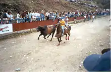 Although baseball, basketball, and football are the top three sports, popularity-wise, in Venezuela, the sport of Coleo has been a favorite past time for many years. The sport is most popular in the eastern and southern regions of the country.[2] The sport is similar to that of American Rodeo, where llaneros or cowboys, will chase cattle but most commonly a bull.[11] There are about three to five llaneros on horseback that will compete against each other and the bull. The objective of the sport is to chase a bull around an enclosed area, about the length of an American football field (100 yards), and pull the animal down to the ground by grabbing its tail.[12] Once a llanero takes down the bull, they must let bull back up so it can continue to run around the arena. They do this by "twisting the bulls tail." Which ever llanero can get the bull down to the ground the most times out of all the riders, will win. The chase lasts about five minutes.[11][12] The sport can be very dangerous, just like rodeo, because the riders can fall off their horses and be trampled by the bull. Also, sometimes the bull can break a leg or become injured, and if this happens the bull is taken immediately to the slaughterhouse, the so-called "manga".[2]