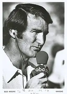 Robert W. "Bud" Moore (born October 16, 1939) is an American former college football player and coach. He served as the head coach at the University of Kansas from 1975 to 1978, compiling a record of 18–26–1. In his first season in 1975, Moore was named Big Eight Coach of the Year and was runner-up to Woody Hayes of Ohio State as the Football Writers Association of America National Coach of the Year. Moore led his team to a 23–3 upset over eventual national champion Oklahoma, breaking the Sooners' 37-game unbeaten streak and handing coach Barry Switzer his first loss.