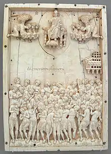 Early Byzantine art was also marked by the cultivation of ivory carving.[26] Ivory diptychs, often elaborately decorated, were issued as gifts by newly appointed consuls.[27] Silver plates were another important form of luxury art:[28] among the most lavish from this period is the Missorium of Theodosius I.[29] Sarcophagi continued to be produced in great numbers.