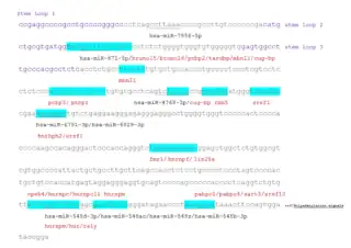 The 3' end of C20orf27 mRNA including all the predicted microRNA binding sites, predicted mRNA binding protein binding sites, and the sequence of three predicted stem loops.