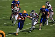 August 12, 2012 1:00 pm season starter game in the Prairie Football Conference. Canadian Junior Football League teams included Calgary and Saskatoon. Calgary Colts were the visitors at Gordie Howe Bowl home to the Saskatoon Hilltops. Andre Lalonde number 20 is seen here coming in with a touchdown at 2:29 p.m.[2]