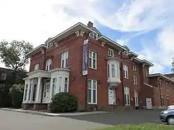 The Calvin Day House is located in Hartford's Asylum Hill neighborhood, north of downtown, at the southwest corner of Myrtle and Spring Streets. It is a two-story brick building, roughly rectangular in shape, with a low-pitch hip roof topped by an octagonal cupola. The roof has an extended eave with paired decorative brackets, and is pierced by gabled wall dormers. The main facade faces east toward Spring Street, and is three bays wide. The ground floor outer bays have tall projecting bays, topped with bracketed roofs. In the center is the main entrance, sheltered by a porch with Corinthian columns supporting a simple entablature. On the Myrtle Street facade is a secondary entrance, above which on the second floor is a projecting oriel window. A mid-20th century wing extends to the rear; it has sympathetic styling. The interior has retained much of its original styling, despite conversion to non-residential use.[2]