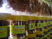 In the Philippines, production centers are located in the Bicol region, provinces of Sorsogon, Albay, and Camarines Sur, southern Tagalog, and eastern Visayas.[6][7] The species is considered a flagship commodity of the Bicol region, the primary location of the pili nut trade.[7] There is almost no commercial planting of this crop; fruits are collected from natural stands in the mountains near these provinces. In 1977, the Philippines exported approximately 3.8 t of pili preparation to Guam and Australia.