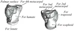 The distal surface is divided by two ridges into three facets, for articulation with the second, third, and fourth metacarpal bones, that for the third being the largest.[1]