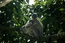 The capped langur (Trachypithecus pileatus) is a species of primate in the family Cercopithecidae. It is native to Bangladesh, Bhutan, India, and Myanmar. Its natural habitat is subtropical or tropical dry forests. It is threatened by habitat loss.[1] They are arboreal and gregarious by nature. A herd of capped langurs consists of 2 to 14 langurs led by a single male. They are herbivorous, eating leaves, twigs, buds and fruits.