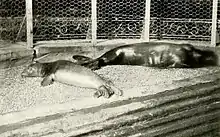 The first Caribbean monk seal to live in captivity for an extended period was a female seal that lived in the New York Aquarium.[14] The seal was captured in 1897 and died in 1903, living in captivity for a total of five and a half years.[14] In 1909, the New York Aquarium acquired four Caribbean monk seals, three of which were yearlings (between one and two years old) and the other a mature male.[15]