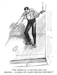 The opening of the door happens again the following night, and this time while Carnacki is speaking to his mother the two of them hear a door slam twice downstairs. The smell of mildew is powerful as Carnacki investigates the house. More doors are heard slamming in the night, but Carnacki can find nothing. The next day, he consults the landlord, and learns something of the house's mysterious history, which includes a former tenant named Captain Tobias, and rumours of a ghostly woman. Several previous tenants had left upon seeing this apparition. The landlord agrees to spend the night in the house as well. In the dead of night, they see a ghostly, naked child running through the house. They have little doubt that it is a supernatural manifestation. The landlord claims to see a woman, apparently searching for the child, although Carnacki cannot see it. All of the seals on the doors are unbroken. As they debate what they have seen, the mildew smell returns, more powerful than ever. The downstairs passages are wet with grotesquely shaped footprints. In his nervousness, the landlord accidentally fires his revolver. No one is hit, but the police arrive to investigate. The physical evidence convinces the officer that an investigation is in order. As they wind up their tour, a second officer sees the ghostly woman. The men follow the wet footprints and smell into the cellars; on the top step, they find a wriggling maggot. Through their investigation of the third cellar, they find that the prints stop at a disused well, filled with water. They watch the well for the rest of the night, but nothing more happens.