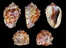 Five views of a shell of Cassis flammea