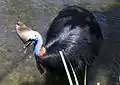Around 90% of the Cassowary diet consists of fruit, although all species are opportunistic omnivores, and take a range of other plant foods, including shoots and grass seeds, in addition to fungi, invertebrates, eggs, carrion, fish, and small vertebrates like rodents, small birds, frogs, lizards, and snakes.[6] Although all ratites can eat meat, Cassowaries, by definition, are the most omnivorous and, therefore, the largest omnivorous bird where meat still forms a minute part of their diet.[7] Indeed, whilst not hypercarnivorous predators like birds-of-prey, cassowaries including juveniles are not picky eaters and are willing to eat anything that could fit in its mouth.[8][9][10] They also have the most varied diet in protein consumption, in contrast to other ratites such as ostriches, where meat is largely used as a substitute in harsh times and is limited to mere invertebrates and small animals. Cassowaries are very wary of humans, but if provoked, they are capable of inflicting serious, even fatal, injuries to both dogs and people. The cassowary has often been labelled "the world's most dangerous bird".[5][11]