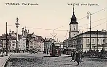 Castle Square (Polish: plac Zamkowy) is a historic square in front of the Royal Castle – the former official residence of Polish monarchs – located in Warsaw, Poland. It is a popular meeting place for tourists and locals. The square, of somewhat triangular shape, features the landmark Sigismund's Column to the south-west, and is surrounded by historic townhouses. It marks the beginning of the bustling Royal Route extending to the south.