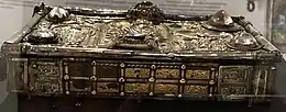 The shrine underwent three main phases of construction. The initial work was completed between 1062 and 1098 at Kells, County Meath while the manuscript was in the possession of the O'Donnells[13] and was their chief relic. A new main face in gilt repoussé was added between 1350 and 1375 with a large seated Christ in Majesty flanked on the right by a Crucifixion scene, and by a saint (likely Columba) on the left.[15][16] Further embellishments and repair works were carried out in the 16th century,[7] and again in 1723 while it under the care of Daniel O'Donel while he was in Paris.[5]