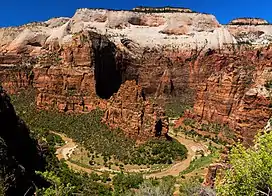Cathedral Mountain is situated at the north end of Zion Canyon, towering 2,500 feet (760 meters) above the canyon floor and the North Fork of the Virgin River which drains precipitation runoff from this mountain. Cathedral is the nearest higher neighbor to Angels Landing, with 0.7 miles (1.1 km) of separation, and the Angels Landing Trail traverses Refrigerator Canyon between them.[4] Other neighbors include The Great White Throne, Observation Point, The Organ, Lady Mountain, Cable Mountain, and parent Mount Majestic. This feature's descriptive name was applied by Stephen S. Johnson in 1922, and officially adopted in 1934 by the U.S. Board on Geographic Names.[3][5] The Spearhead, elevation 5,804-ft, is the southernmost tip of this mountain, and is prominently featured from Zion Lodge.[6] The first ascent of Cathedral was made by Walter Becker, Fritz Becker, and Rudolph Weidner on August 31, 1931.[7]