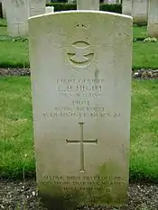 Hight's funeral was held on 19 August, conducted by Canon Headley Burrows. His coffin was carried by six RAF officers[8] and draped with the British and New Zealand flags, and his uniform cap. He was buried with military honours including a firing volley and officers' salute.[10] Among the wreaths was a bunch of flowers from the garden where he fell.[8] He is buried in an area of Commonwealth War Graves in Bournemouth East Cemetery.[2] His family chose a quotation from the Book of Proverbs for his headstone, 'I love them that love me, and those that seek me early shall find me'.