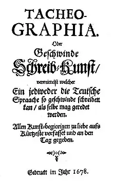Ramsay became known as the publisher and publicist of a system of shorthand, no earlier than 1678. In the 1650s there had been the shorthand of Jacques Cossard; in the 1660s that of Daniel Georg Morhof; and Thomas Shelton's system had become known in an exposition by Gaspard Schott. Tacheographia, oder, Geschwinde Schreib-Kunst (Frankfurt, 1678) is the first verifiable appearance of Ramsay's system. It certainly was adapted from that of Shelton, with minor changes, and Johann Christoph Mieth in 1679 accused Ramsay of plagiarism. In 1681 Latin and French editions followed.[2]