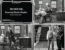 Essanay Studios in Chicago was the capital of Chicago film in the first decades of the 1900s. Charlie Chaplin started his career in 1915 at Essanay Studios. He was hired in 1915 and paid $1,250.00 per week.[4] Chaplin improvised the scripts that were given to him by adding slapstick humor. Ben Turpin, fellow actor for Essanay, and Chaplin worked together on slapstick projects. Turpin was cross-eyed which made him a natural sidekick to the antics of Chaplin.[4] Chaplin's only full feature production at Essanay was called His New Job.[5] Another notable actress who found a beginning at Essanay Studio was Gloria Swanson. Swanson would later star in many television and film productions including the smash hit Sunset Boulevard.