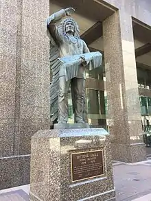 Sitting Eagle, also known as John Hunter, was the chief of the Stoney Nakoda First Nation in the town of Morley, Alberta, which is home to the Chiniki, Bearspaw, and Wesley bands of Nakoda.[1] Chief Sitting Eagle was born in 1874[2] and became heavily involved in the Calgary Stampede, over the years coming to be considered a symbol of the event himself. He died in 1970. In 1988, a 3.4-metre (11 ft) statue of Chief Sitting Eagle was unveiled in downtown Calgary.