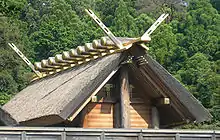 Chigi (千木, 鎮木, 知木, 知疑), Okichigi (置千木) or Higi (氷木) are forked roof finials found in Japanese and Shinto architecture. Chigi predate Buddhist influence and are an architectural element endemic to Japan.[1] They are an important aesthetic aspect of Shinto shrines, where they are often paired with katsuogi, another type of roof ornamentation. Today, chigi and katsuogi are used exclusively on Shinto buildings and distinguish them from other religious structures, such as Buddhist temples in Japan.