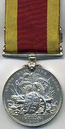 The China War Medal 1900 was a British campaign medal approved on 1 January 1902 for issue to British and Indian land and sea troops who served during the Boxer Rebellion, between 10 June and 31 December 1900.[1] The medal was issued in silver to combatants and in bronze to native, namely Indian, bearers drivers and servants.[3]