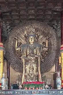 The Hall of Great Compassion is seven rooms wide and four rooms deep with double eaves gable and hip roofs. It still preserves the structural and architectural style in the Ming dynasty. In the middle of the hall placed the statue of Thousand-armed and eyed Guanyin with statues of Thousand-armed and bowls Manjusri and Samantabhadra stand on the left and right sides. The statues were made in the Hongwu period of the Ming dynasty. Each of them is 8.5-metre (28 ft) high.[4]
