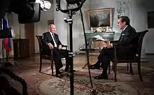 In July 2018, Wallace interviewed Russian leader Vladimir Putin. Wallace questioned Putin about why so many of his political opponents end up dead, and sought to hand Putin papers containing the indictment of 12 Russian agents for interference in the 2016 election. Putin declined to touch the papers.[46][47] According to The Washington Post's Aaron Blake, Putin was "clearly frustrated by a journalist actually challenging him".[46] According to The New York Times, Wallace's interview was "widely praised".[48] His interview earned him a News and Documentary Emmy Award for Outstanding Live Interview.[49] It was the first News and Documentary Award in Fox News' history.[50]