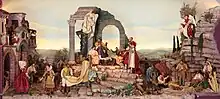 The tradition of the nativity scene comes from Italy. Nativity scenes are known from 10th-century Rome. They were popularised by Saint Francis of Assisi from 1223, quickly spreading across Europe.[7] Different types of decorations developed across the Christian world, dependent on local tradition and available resources, and can vary from simple representations of the crib to far more elaborate sets – renowned manger scene traditions include the colourful Kraków szopka in Poland,[8] which imitate Kraków's historical buildings as settings, the elaborate Italian presepi (Neapolitan, Genoese and Bolognese),[9][10][11][12] or the Provençal crèches in southern France, using hand-painted terracotta figurines called santons.[13] In certain parts of the world, notably Sicily, living nativity scenes following the tradition of Saint Francis are a popular alternative to static crèches.[14][15][16] The first commercially produced decorations appeared in Germany in the 1860s, inspired by paper chains made by children.[17] In countries where a representation of the Nativity scene is prevalent, people are encouraged to compete and create the most original or realistic ones. Within some families, the pieces used to make the representation are considered a valuable family heirloom.