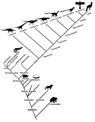 A cladogram (from Greek clados "branch" and gramma "character") is a diagram used in cladistics to show relations among organisms. A cladogram is not, however, an evolutionary tree because it does not show how ancestors are related to descendants, nor does it show how much they have changed, so many differing evolutionary trees can be consistent with the same cladogram.[1][2][3][4][5] A cladogram uses lines that branch off in different directions ending at a clade, a group of organisms with a last common ancestor. There are many shapes of cladograms but they all have lines that branch off from other lines. The lines can be traced back to where they branch off. These branching off points represent a hypothetical ancestor (not an actual entity) which can be inferred to exhibit the traits shared among the terminal taxa above it.[4][6] This hypothetical ancestor might then provide clues about the order of evolution of various features, adaptation, and other evolutionary narratives about ancestors. Although traditionally such cladograms were generated largely on the basis of morphological characters, DNA and RNA sequencing data and computational phylogenetics are now very commonly used in the generation of cladograms, either on their own or in combination with morphology.