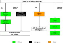 During the Second World War, the United States Office of Strategic Services (OSS; the predecessor to the Central Intelligence Agency and to part of United States Army Special Forces) worked closely with the British Secret Intelligence Service (SIS), Special Operations Executive (SOE), and Political Warfare Executive (PWE). The latter two organizations were wartime, and their functions were merged back into SIS after the war.