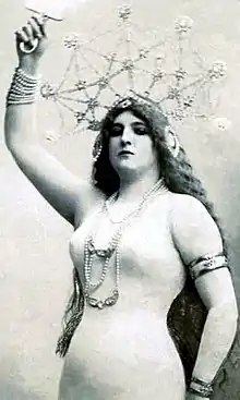 She employed her beauty and celebrity to pose on various stages, including the Folies Bergère and likely the Moulin Rouge, while wearing form-fitting costumes. She called her art form poses plastiques. Henri de Toulouse-Lautrec made a scarce lithograph of her and Rigó in 1897 titled Idylle Princière. She was often photographed, and featured on many postcards during the Edwardian period, sometimes in a pose plastique and sometimes in a more or less conventional dress. Kaiser Wilhelm II is said to have forbidden the publication or display of her photograph in the German Empire because he thought her beauty "disturbing".
