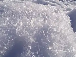 - Surface hoar – Surface hoar is manifest as striated, usually flat, sometimes needle-like crystals, usually deposited as frost on a snow surface that is colder than the air. Crystals grow rapidly by transfer of moisture from the atmosphere onto the snow surface, which is cooled below ambient temperature by radiational cooling.[23] Subsequent snowfall can bury layers of surface hoar, incorporating them into the snowpack where they can form a weak layer.[26]