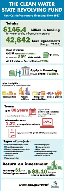 - 1 2 3 "Learn about the Clean Water State Revolving Fund (CWSRF)". EPA. Retrieved 6 May 2018.