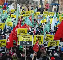 Other conceptions frame climate justice in terms of the need to curb climate change within certain limits, like the Paris Agreement targets of 1.5 °C, as otherwise the impacts of climate change on natural ecosystems will be so severe as to preclude the possibility of justice for many generations and populations.[16] Other activists argue that failure to address social implications of climate change mitigation transitions could result in profound economic and social tensions and delay necessary changes[17] while ways that reduce greenhouse gas emissions in a socially just way – called a 'just transition'[18][19] – are possible, preferable, in better agreement with contemporary human rights, fairer, more ethical as well as possibly more effective.[20][21][22]