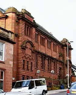 The building was category B listed by Historic Scotland in 1993. It is a large, two-storey building of pink Corsehill sandstone, in the Beaux-Arts style.[3] The design was chosen by competition.[4] Built on a steep hill on Academy Street, it has an imposing looming presence. The rear of the building can be seen on the Coatbridge skyline when approached from the west via the A89 road.