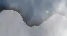 Storms are caused by katabatic wind, a concentrated flow of cold air moving along the steep surface of the ice shield towards the sea. The air flow is accelerated by the increasing gradient of the surface of ice and the cliff monolith at Cape Denison. In the summer there are periods of relative calm but during winter storms are especially strong and long lasting, and can start and end unexpectedly. An abrupt start and end of storm might be accompanied by powerful whirlpools and expressive short-lived and fast-moving clouds at the coast line.[1]