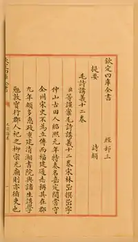 - ↑ 中國大百科全書編委會 (ed.). "四庫七閣、《四庫全書》、《四庫全書總目提要》". 中國大百科全書(第二版)(第21冊). p. 146-147. ISBN 9787500079583.