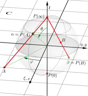 Stereographic projection of a complex number A onto a point α of the Riemann sphere