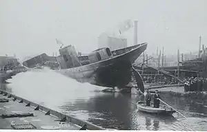 The new yard initially produced trawlers and whalers with dredging of the River Hull allowing larger ships to be built.[4] During both world wars it built large numbers of ships such as minesweepers and anti-submarine trawlers for the Royal Navy. Between the wars it consolidated its reputation as a builder of high quality trawlers and continued to prosper into the 1950s. In 1954 the shipyard employed 650 workers and built 15 vessels (including three minesweepers, four trawlers, and a tug), but by 1960 the workforce had declined to 600 and after struggling to find orders Cook, Welton & Gemmell built their last ship in 1962 and went into voluntary liquidation in 1963.[5]