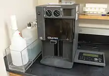 A Coulter counter[1][2] is an apparatus for counting and sizing particles suspended in electrolytes. The Coulter counter is the commercial term for the technique known as resistive pulse sensing or electrical zone sensing. The apparatus is based on the Coulter principle named after its inventor, Wallace H. Coulter.