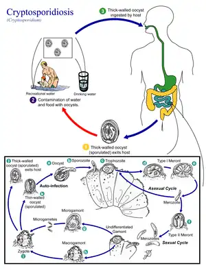 Cryptosporidiosis is typically an acute, short-term infection, can be recurrent through reinfection in immunocompetent hosts, and become severe or life-threatening in immunocompromised individuals. In humans, it remains in the lower intestine and may remain for up to five weeks.[6] The parasite is transmitted by environmentally hardy cysts (oocysts) that, once ingested, exist in the small intestine and result in an infection of intestinal epithelial tissue.[6] Transmission by ingestion or inhalation of coughed on fomites is a second, less likely route of infection.[1]