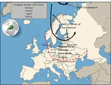 ![]() Path of Cyclone Herwart-Ingolf across Europe (Part of the 2017–18 European windstorm season) | |