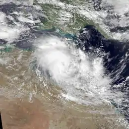 The system was subsequently considered to have peaked as a Category 2 tropical cyclone on 31 December, with 10-minute sustained winds estimated at 110 km/h (70 mph) by the BoM.[2] Several hours later, the system made landfall between Aurukun and the Edward River mission, Queensland, at around 20:00 (Australian Eastern Standard Time, 11:00 UTC).[3] As Peter made landfall during 31 December winds of 120 km/h (75 mph), were reported from both Fitzroy Island and the Edward River mission weather stations.[1] Over the next couple of days the system gradually weakened over land, before it emerged into the Coral Sea near Cooktown, Queensland, on 1 January.[4] The system subsequently weakened below tropical cyclone intensity and became a tropical low during 2 January.[5] The system was last noted on the following day as it degenerated into a complex low pressure system and moved back over the Cape York Peninsula.[4][6] The complex low subsequently moved westwards over the Peninsula and into the Gulf, where it developed into Tropical Cyclone Greta.[7]