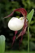 Cypripedium is a genus of 58 species and nothospecies of hardy orchids; it is one of five genera that together compose the subfamily of lady's slipper orchids (Cypripedioideae). They are widespread across much of the Northern Hemisphere, including most of Europe and Africa (Algeria[2]) (one species), Russia, China, Central Asia, Canada the United States, Mexico, and Central America.[1][3][4][5] They are most commonly known as slipper orchids, lady's slipper orchids, or ladyslippers; other common names include moccasin flower, camel's foot, squirrel foot, steeple cap, Venus' shoes, and whippoorwill shoe. An abbreviation used in trade journals is "Cyp." The genus name is derived from Ancient Greek Κύπρις (Kúpris), an early reference in Greek myth to Aphrodite, and πέδιλον (pédilon), meaning "sandal".[6]