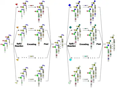 In order to apply combinatorial chemistry for the synthesis of DNA-encoded chemical libraries, a Split-&-Pool approach was pursued.[11][12] Initially a set of unique DNA-oligonucleotides (n) each containing a specific coding sequence is chemically conjugated to a corresponding set of small organic molecules. Consequently, the oligonucleotide-conjugate compounds are mixed ("Pool") and divided ("Split") into a number of groups (m). In appropriate conditions a second set of building blocks (m) are coupled to the first one and a further oligonucleotide which is coding for the second modification is enzymatically introduced before mixing again. This “split-&-pool” steps can be iterated a number of times (r) increasing at each round the library size in a combinatorial manner (i.e. (n x m)r). Alternatively, peptide nucleic acids have been used to encode libraries prepared by "split-&-pool" method.[14] A benefit of PNA-encoding is that the chemistry can be performed by standard SPPS.[15]
