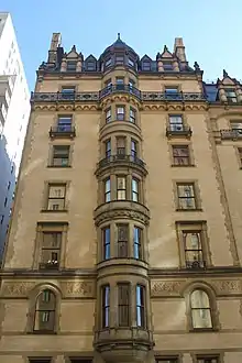 The 72nd Street elevation contains projecting turrets, which rise the entire height of the facade.[26][6] A depiction of a Native American's head is carved on the facade.[50] Above the second story is a horizontal band course made of terracotta.[26][27] The band course is decorated with a diaper pattern.[17] Above the sixth story is a stone cornice, which separates the seventh story and the roof from the rest of the facade.[26][27] The cornice is supported by large brackets and is topped by an ornate metal balustrade.[6] The building is topped by gables at each of its corners.[17][27] The 72nd Street elevation also has a gable above the central entrance. On Central Park West, the central section of the roof is a hip roof. Originally, arched balconies connected the gables.[27] The roof is covered with slate tiles, and dormer windows and corbeled brick chimneys protrude from the roof at multiple locations. The dormer windows are arranged in two to four levels and alternately contain either stone or copper frames.[26]