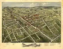 The central part of Danbury was incorporated as a borough in 1822. The borough was reincorporated as the city of Danbury on April 19, 1889. The city and town were consolidated on January 1, 1965.