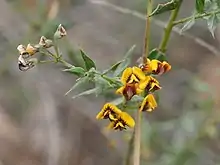 Daviesia umbellulata is a slender shrub that typically grows to a height of 0.3–1 m (1 ft 0 in – 3 ft 3 in) and has ribbed branchlets. The phyllodes are egg-shaped to linear, sometimes with a heart-shaped base, 7–30 mm (0.28–1.18 in) long and 0.5–8 mm (0.020–0.315 in) wide with a sharply-pointed tip. The flowers are arranged in groups of three to six, the groups on a peduncle 3–50 mm (0.12–1.97 in) long, the individual flowers on pedicels 4–5.5 mm (0.16–0.22 in) long. The five sepals are 3.0–3.5 mm (0.12–0.14 in) long and joined at the base, the upper two joined in a single "lip" and the lower three less than 1 mm (0.039 in) long. The standard petal is egg-shaped with a central notch, yellow to orange with a dark maroon base and 5–7 mm (0.20–0.28 in) long, the wings yellow with a maroon base and 4.5–6.0 mm (0.18–0.24 in) long, and the keel is maroon and 4.0–4.5 mm (0.16–0.18 in) long. Flowering occurs from August to November and the fruit is a triangular pod 8–9 mm (0.31–0.35 in) long.[2][3]